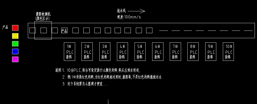 使用時間是不準確的,,速度變化,啟動停止,還有斷電記憶如何做?這些的就是時間不能解決的問題 加個光電檢測每一個產品,使用這個信號作為寄存器的移位指令就可以實現了 攝像頭的判斷顏色的,用0-10代表不同的顏色,當移到相應的位置相同的話就動作就行了 |