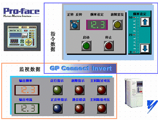 GP和變頻器實(shí)現(xiàn)了RS485通訊,但目前主要難點(diǎn)是GP界面如何編輯,變頻器內(nèi)部功能代碼如何設(shè)置,我想實(shí)現(xiàn)的HMI界面如下,希望能有高手給予解答。 |