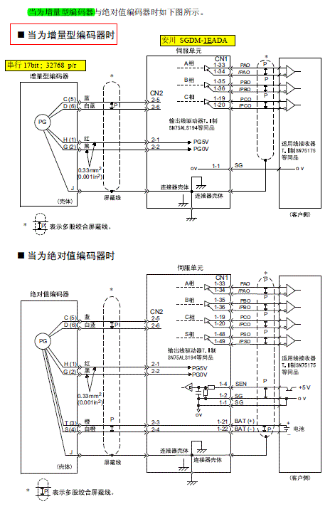 這是安川伺服給出的編碼器接線,(CN2)這個插接頭是增量型與絕對型共用的,僅絕對值類型多兩跟電池線.有哪位大俠能解釋下增量編碼器信號與伺服控制器之間的傳輸機制嗎?