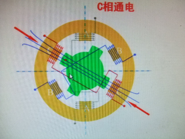 當某相定子勵磁后,它吸引轉子,轉子的齒與該相定子磁極上的齒對齊,轉子轉動一個角度,換一相得電時,轉子又轉動一個角度。如此每相不停地輪流通電,轉子不停地轉動。