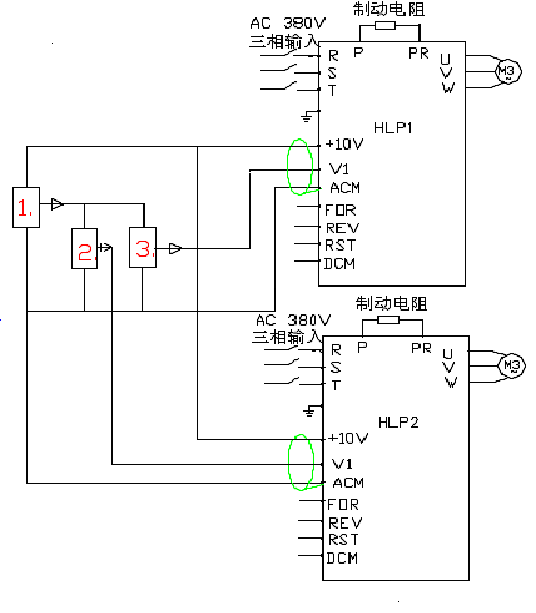 兩臺電機(jī)用兩臺變頻器!!!!中繼同步啟停!!!!!電位器這樣接