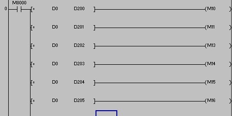 D0為輸入值   D0與D200~D212  各項進行比較  相等時輸出    怎么編寫梯形圖或用那條指令啊?  謝謝  (或者CMP指令一條一條比較??)