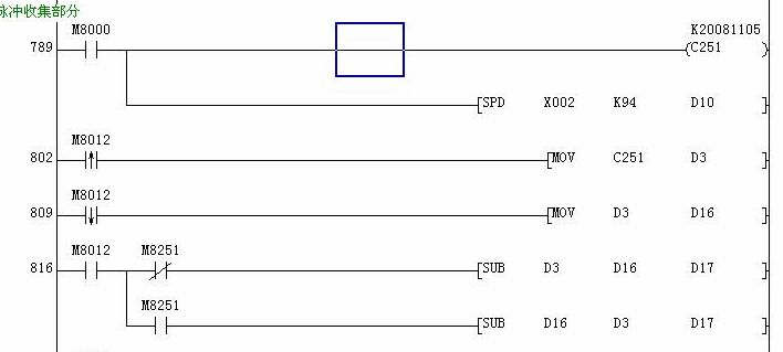 三菱FX2N PLC       用C251來收集X0 和X1的脈沖用于檢測位置的變化,同時又要收集速度值,因為SPD的指令這個時候是不能用的。有什么方法來完成?我試了一種方法。差不多能解決,速度(D17的值)只是參考值。大家看看有沒有不妥