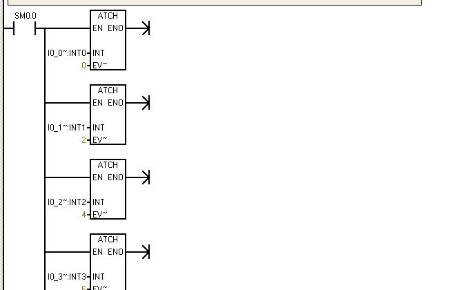 在激活一個中斷程序前,必須在中斷事件和該事件放生時希望執(zhí)行的那段程序之間建立一種聯(lián)系。中斷連接指令(ATCH)指定某中斷事件(由中斷事件號指定,EV)所要調(diào)用的程序段(由中斷程序號指定,INT)。多個中斷事件可調(diào)用同一個中斷程序,但一個中斷事件不能同時指定調(diào)用多個中斷程序。INT 輸入端數(shù)據(jù)類型為BYTE操作數(shù)為常熟(0到127)。EVNT端數(shù)據(jù)類型為BYTE操作數(shù)為常數(shù)(CPU221和222:0到12,19到23和27到33——CPU224:0到23和27到33——CPU224XP和CPU226:0到33)每個中斷事件號0到33都分別對應(yīng)一個中斷描述功能,你可以翻書查閱!!對于你這個程序只是將4個中斷事件與中斷程序進行連接。。。不知道這樣解釋您清楚了沒有!! ![]() |