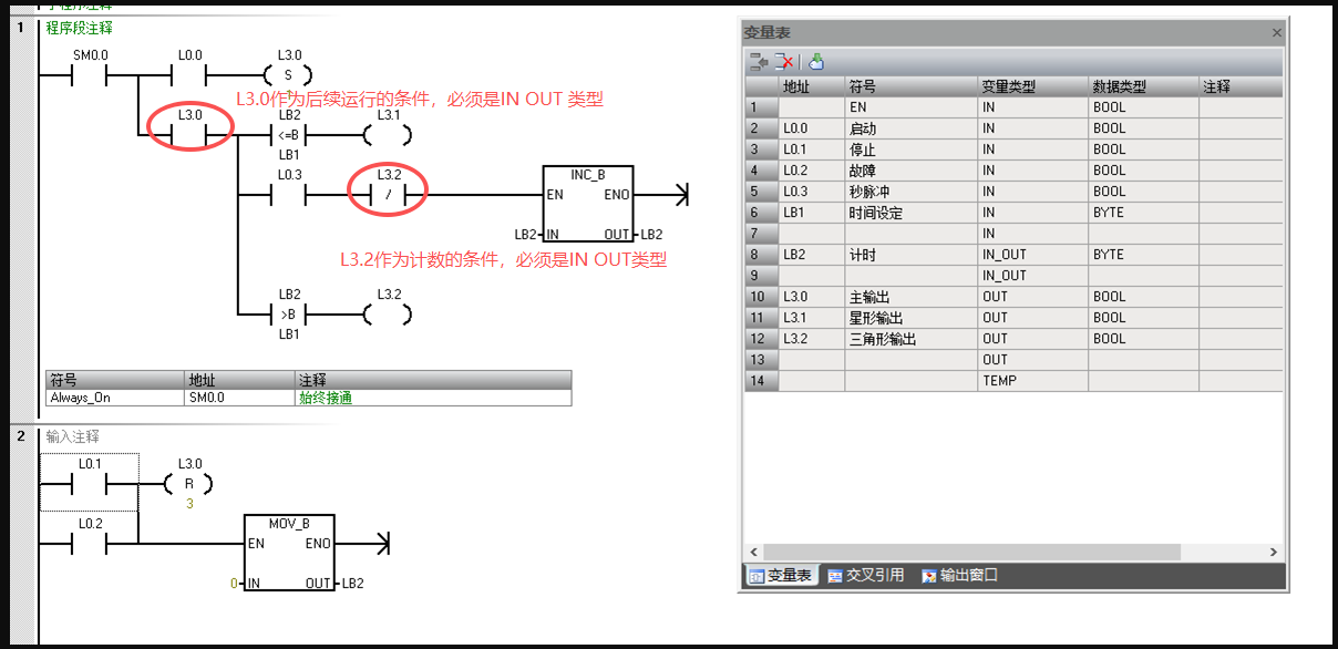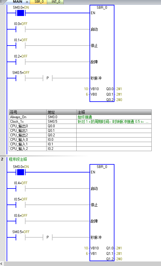 smart200做一個帶參星三角子程序,調用兩次。I0.0啟動時,兩個子程序都會有輸出。實在想不出哪個地方做的不對,請師傅們幫我看一下,錯誤在哪兒?! |