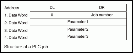 一個 PLC 作業包含 4 個數據字。第一個數據字包含作業號。根據所指定的作業號功能,最多可以在數據字 2 到 4 中傳入 3 個參數。下圖顯示了該數據結構。