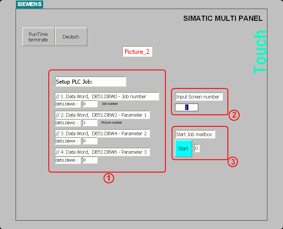 * 通過控制器將希望調用的畫面編號輸入作業信箱的第二個數據字( DB51.DBW2 )。如果需要,還可以在作業信箱的第四個數據字 ( DB51.DBW6  ) 中輸入畫面中相應的域號。