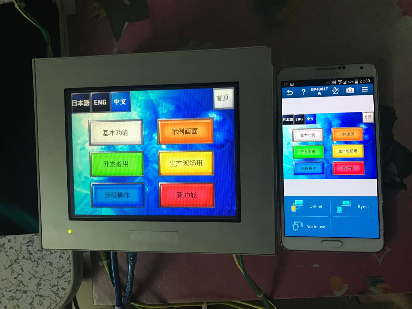 方案:proface4000系列以上,帶網口的觸摸屏。軟件PROEX4.0以上。手機或者智能終端APP: Rrmote HMI.
