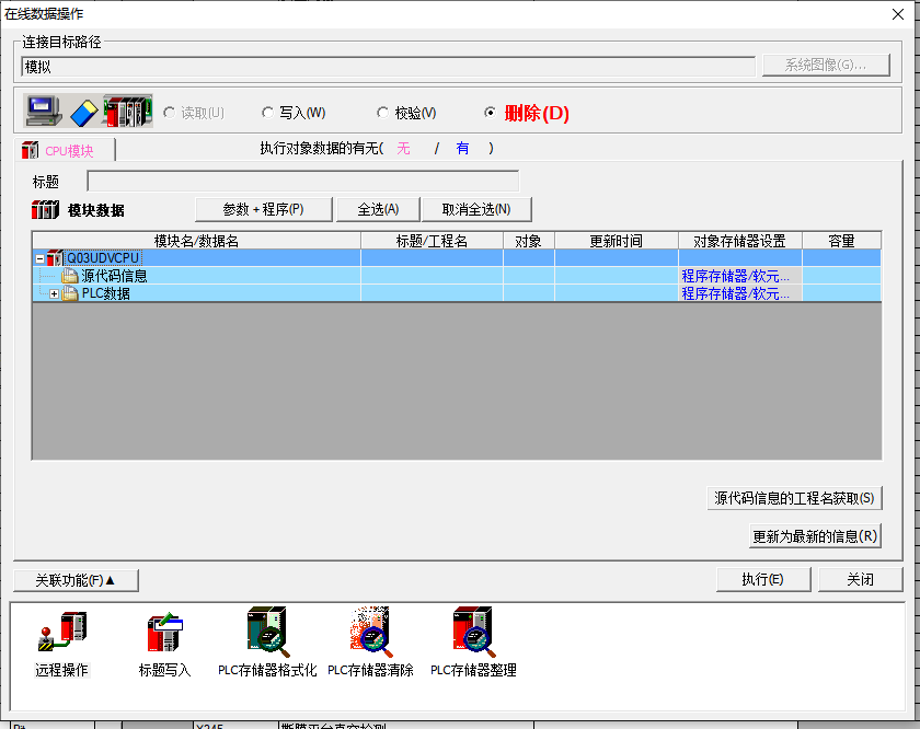 深度拓展,我的這個(gè)工程類型是簡(jiǎn)單工程加使用標(biāo)簽,所以多了一項(xiàng)源代碼信息。當(dāng)時(shí)程序還比較小,所以選擇寫入源代碼信息。隨著程序變大,容量不夠用,寫入程序就沒(méi)有選擇寫入源代碼信息。但是PLC存儲(chǔ)器里還會(huì)有之前寫入的源代碼信息,占用容量,需要手動(dòng)刪除。可能由于多次不帶源代碼信息寫入程序,導(dǎo)致很早之前留存在存儲(chǔ)器里的源代碼信息就處于特殊狀態(tài),沒(méi)辦法直接刪除通過(guò)PLC數(shù)據(jù)刪除功能刪除,最后使用PLC存儲(chǔ)格式化刪除。