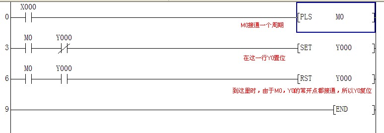 實際上從程序中來看,Y0是有個置位過程(要是Y0沒有置位,也就不會有下一行的復位動作)。但由于PLC工作原理的原因(此時的結果只放在輸出緩存寄存器里,Y0是ON),到下一行時,由于M0=ON,Y0=ON,RST Y0成立,結果為Y0=OFF(這時輸出緩存寄存器里Y0=OFF)。