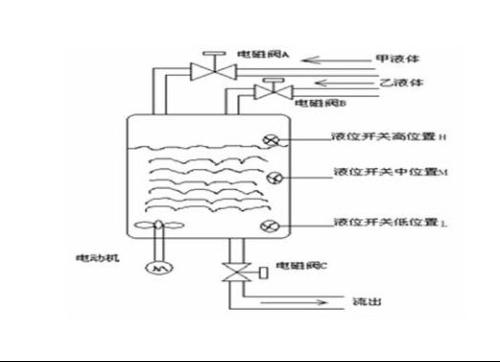 1.在最下方時(shí),則應(yīng)該先按復(fù)位按鈕,排出罐內(nèi)液體,保證料位液面處于最下方或容器是空的,這時(shí)各個(gè)閥門(mén)A、B、C均為OFF,液位傳感器H、M、L均為OFF,電動(dòng)機(jī)M為OFF。