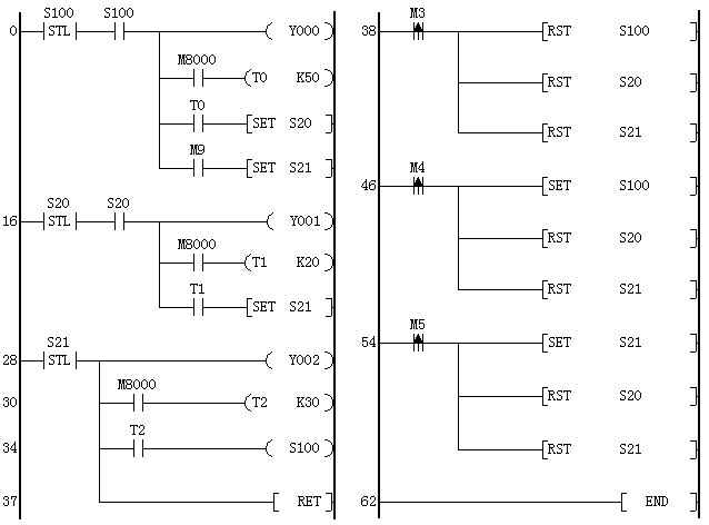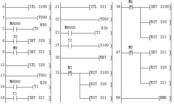 T1計時到,S21置位接通,其21行STL接點接通,Y2通、Y1斷;T2計時到,S100接通,重復前一個循環。
