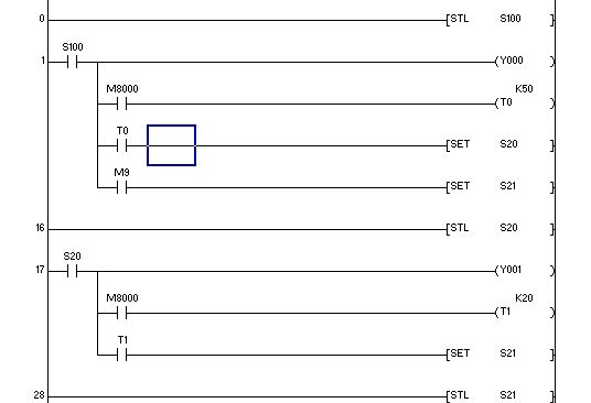 如果是2樓所示梯形圖,可以把STL S100看成是一個接點(STL接點);這樣,Y0是接在STL接點后的,而不是直接接在母線上。而T0接的M8000也是可以去掉的,這時需用一豎線連至Y0的橫線上,而不能直接連于“母線”(語法問題);或者從語句表中修改,再轉換為梯形圖。