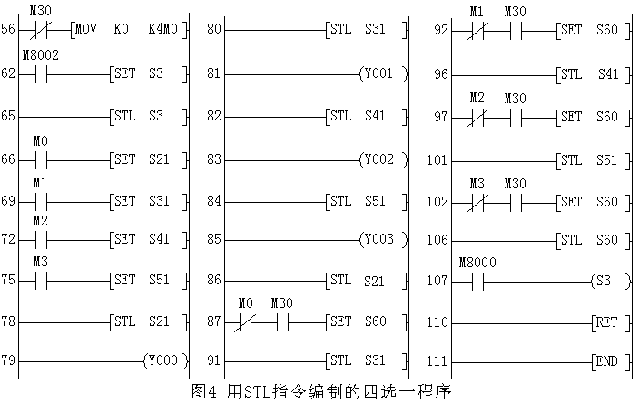 而在文獻[1]的第6.3節,還專門談到了“多選一程序的編寫”;據此,本文以四選一為例,就FX型PLC談談程序的編制方法。