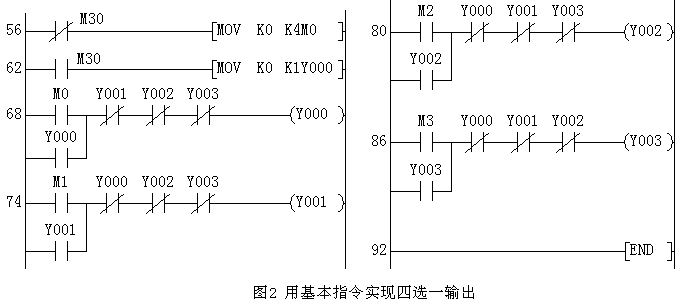 接圖1程序,用基本指令實現四選一輸出的程序見圖2。該程序,當有多個接通信號時,輸出保持原狀態不變,后接通的信號無效。