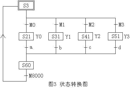 采用選擇性分支,其狀態轉換圖參見圖3。當輸入信號正確時,轉換到相應的流程。例如,當僅有X0接通時,M0接通,則狀態器轉換到S21接通。實際程序中,在STL 21之后,還可以設立一系列動作或狀態。