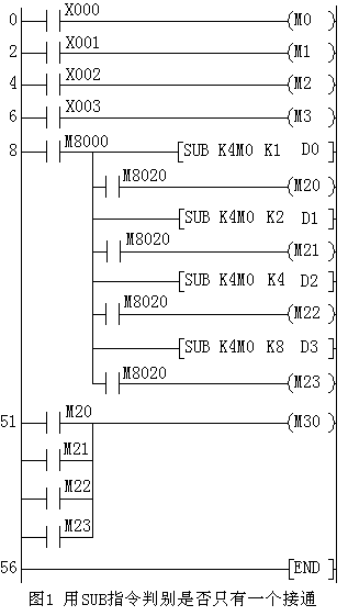 參見圖1,M8020是零標志,當SUB指令運算結果為0時,M8020接通。例如,當X1接通,則M1接通,由位元件組合成的字(K4M0)=1,所以M20接通。