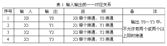 給定四個輸入X0、X1、X2、X3,四個輸出Y0、Y1、Y2、Y3;每個輸入對應一個輸出,但每次最多僅允許一個輸出接通;當輸入X0~X3全部斷開時,輸出Y0~Y3保持前一狀態不變;參見表1。