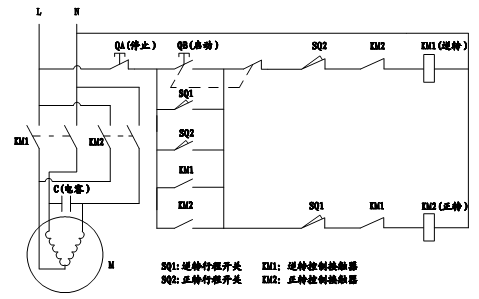 用啟動(dòng)、停止開(kāi)關(guān)加正、逆轉(zhuǎn)行程開(kāi)關(guān)控制單相電容電動(dòng)機(jī)的電路原理圖