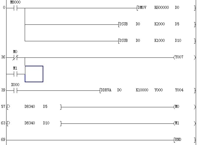 各位老師好!我在做定位控制中,要把DRVA指令運行當中的當前值減去K2000,假如我設定發出的脈沖數是D0是K600000,當脈沖發到580000個時M0接通,發到590000個脈沖時M1接通,但我在運行監視當中并未能按照我的要求動作,D8340和D0以及其它D里面的值都不對,D0甚至都不是600000,D8340(其實我也知道Y0發出脈沖值是在D8340和D8341里面)里面的也都不是當前所發出脈沖的值,而且還有負數出現(脈沖發完了也還有負數顯示,動作完成后我都把K0傳送到D8340和D8341里面),為什么?要怎樣做才是對的?后來我只能不用這些指令了,但是我做的這臺氬弧焊焊接設備如果能按照我的想法動作效果會更好(Y7是焊接控制,焊接完成前收弧)。下圖是我做的差不多的梯形圖(應用中我做的梯形圖是步進梯形圖,D值的設定用文本屏)。