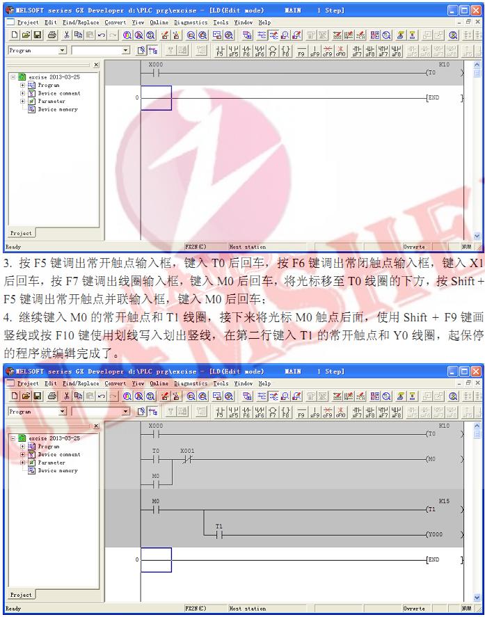 2. 按F5鍵調出常開觸點輸入框,鍵入X0后回車,按F7鍵調出線圈輸入框,鍵入T0 K10(需注意數字0而非字母O,且中間需加空格)后回車,該條指令即編輯完畢;