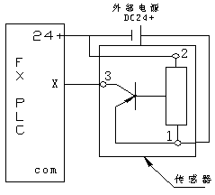 三菱 FX-PLC 的輸入端子既可以接受電流輸入也可接受電流輸出的連接方式,(即 FX-PLC 的輸入端子既可作為漏型輸入也可作為源型輸入連接)關鍵要掌握接線方式。具體接線方式按下述: NPN 型接近開關接成漏型輸入方式,只需將接近開關的開關輸出端子( + )接入 PLC 的輸入端子,接近開關的另一端子(—)接 PLC 的 COM 端。 PNP 型接近開關接成源型輸入,則應把 PLC 的 24V+ 端子接外部電源的負極,外部電源的正極接接近開關的( + )端子,接近開關的另一端(—)則接 PLC 的輸入端子。