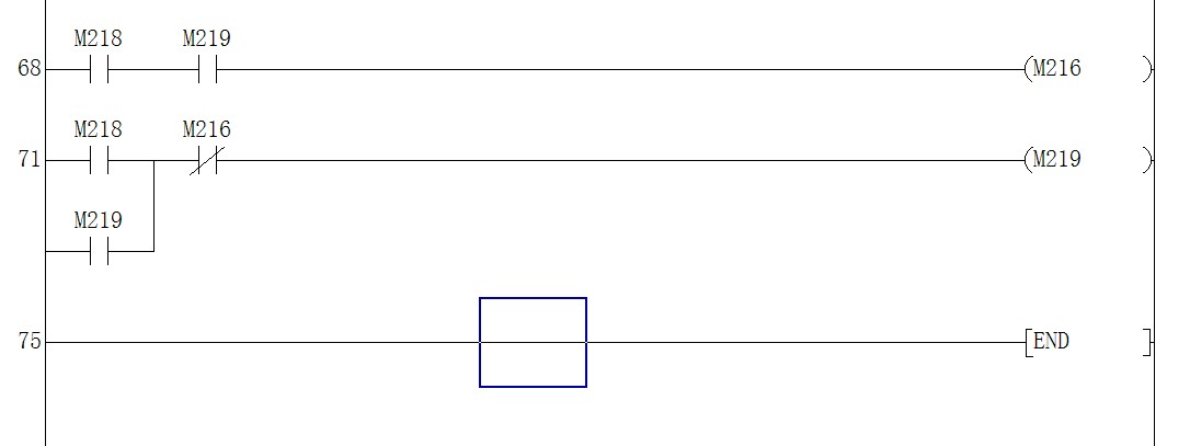 因為M218也是脈沖訊號,在68步此時M219還未ON,當執行到71步M219置ON,下一次掃描時,M218己off,故M216還是不能ON