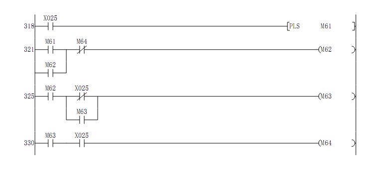 如果刪除了325那段程序時,M62只能是點動了。X25通,那么M62也通,那M64也會通,這時OUT M64就會斷開,按一下X25時,M62脈沖式的通一下就斷了,所以M62永遠無法自鎖保持。