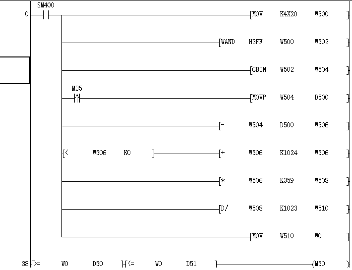 多謝了,我還以為像變頻器一樣的是通道地址,還有不明白的是為什么要加這條程序呢,傳送X20-X2F數值到W500中,我想應該是QX40-S1讀取的格雷碼編碼器的值吧(不知對不對個人想法),再用GBIN指令轉成16位二進制就行了啊,為什么還要加上十六進制的3FF也就是十進制的1023這個數呢,這段程序是別人給的可在觸摸屏上設置的多角度控制停機的PLC程序,還有< W506 K0就是大于0時,為什么加K1024,后面的*359,/1023啊,不知道是什么意思,只知道W0是現實角度,還望各位大神指點 |
