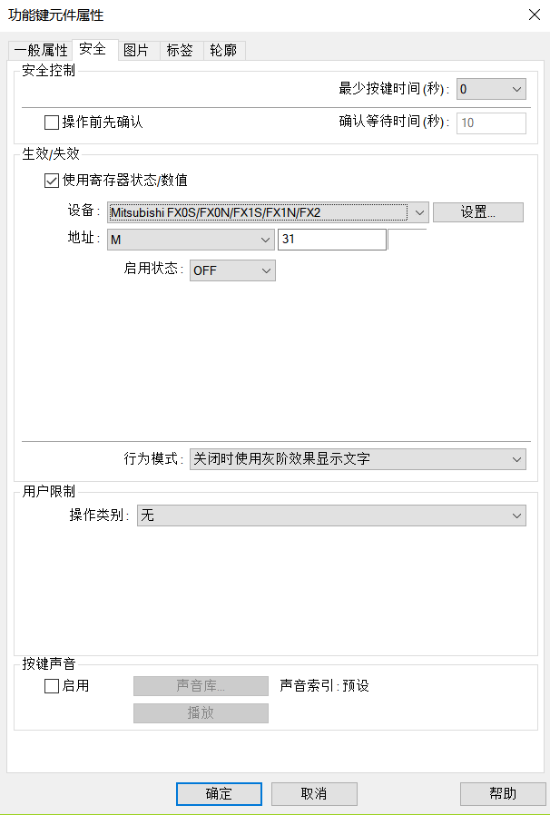你好,師傅。當(dāng)運(yùn)行時(shí)候保持輸出一個(gè)M31設(shè)為ON,在功能鍵——安全里面按照你這樣設(shè)置了 。還是不能灰階顯示