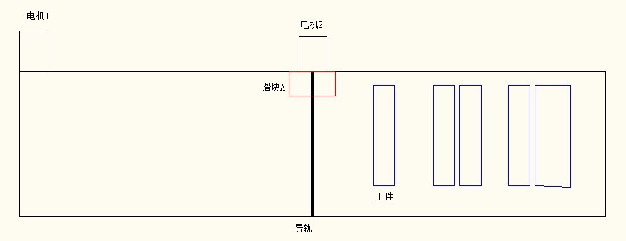 電機1一直轉(zhuǎn),帶動工件運轉(zhuǎn),當(dāng)工件運行到導(dǎo)軌底下時電機1停止,電機2啟動,帶到滑塊A沿導(dǎo)軌運行到另一端立即再回到原點,然后電機1再啟動,直到下一工件到導(dǎo)軌底下,如此循環(huán)。