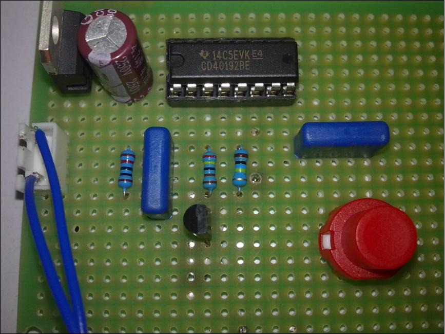 板子上的元器件:7812、一個極性電容(濾波)和兩個非極性電容(0.1uF)、IC(40192)、2K電阻、10K電阻、100K電阻各一個,一個三極管、一個按鈕。