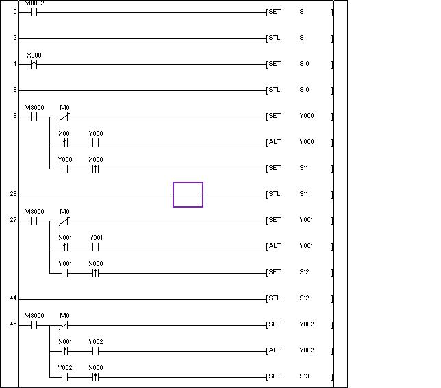 其中單步動作要求如下,當(dāng)按下按鈕A時,氣缸1置位,再按下氣缸2置位,再按下氣缸3置位。此時若按下按鈕B,則氣缸3復(fù)位。再按下按鈕A時氣缸3再置位……..即要求按鈕A按下時一直單步向下運(yùn)行,若中途按下按鈕B時要求當(dāng)前的動作復(fù)位,返回到上一狀態(tài)。其中按鈕A可以讓整個程式一直循環(huán)運(yùn)行下去(含置位及復(fù)位),使用按鈕B主要是為了中間操作時出現(xiàn)失誤讓前一步返回,可以讓按鈕A繼續(xù)操作下去,不用整個程式復(fù)位,節(jié)省操作時間,使用方便。 使用三菱FX1N PLC。請大家指導(dǎo)下思路。謝謝!