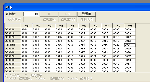 LD SM402 DMOV K0 Z0 CALL P0 FEND P0 FOR K9 LD SM400 INC Z0 MOV K1 Z1 * Z0 K10 D0 + D0 K1 Z2 FOR K9 LD SM400 * Z0 Z1 D0Z2 INC Z2 INC Z1 NEXT NEXT RET END |