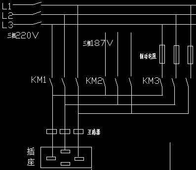 已查出電路,如圖所示,看現場接觸器動作是,先開KM2,5秒后啟動KM3,KM3啟動后復位KM2(這里看著有大約0.5秒的延遲)然后啟動KM1,接著復位KM3(此處大約也有0.5秒的延遲)開始正常供電。187V來自線體總的變頻電源,KM1和KM2互鎖。請大神幫忙看看這個動作對不對。