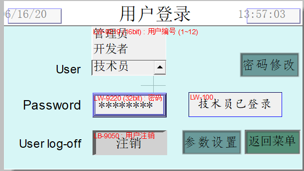 現有兩個用戶權限,一個技術員,一個管理員。當我用技術員權限進入時。我想在觸摸屏的左上角顯示    “技術員”  這三個字,管理員也同理。。。。應該怎么弄。。