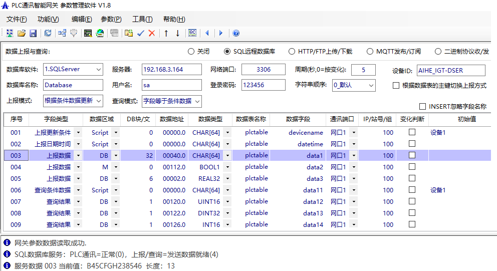 然后通過智能網關的參數軟件(附件內有),設置PLC與數據庫相關參數,包括服務器主機IP地址、端口,用戶名密碼,以及上報與查詢的模式、PLC數據地址與數據表字段的對應關系等,如下圖: