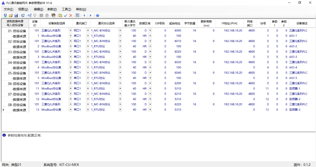 根據(jù)以上結(jié)構(gòu)圖,通過網(wǎng)關(guān)參數(shù)配置軟件(下載地址),配置相關(guān)PLC的寄存器地址與Modbus寄存器的地址對應(yīng),分配PLC的IP地址端口號碼,以及IO模塊,變頻器的站號等。配置完成后下載到網(wǎng)關(guān)模塊(參數(shù)->參數(shù)寫入到網(wǎng)關(guān)),然后重啟(工具->重啟網(wǎng)關(guān))即可。