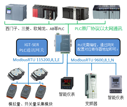 案例是通過一個IGT-SER智能網(wǎng)關(guān),實現(xiàn)遠(yuǎn)程IO模塊、智能儀表,變頻器與PLC通訊。