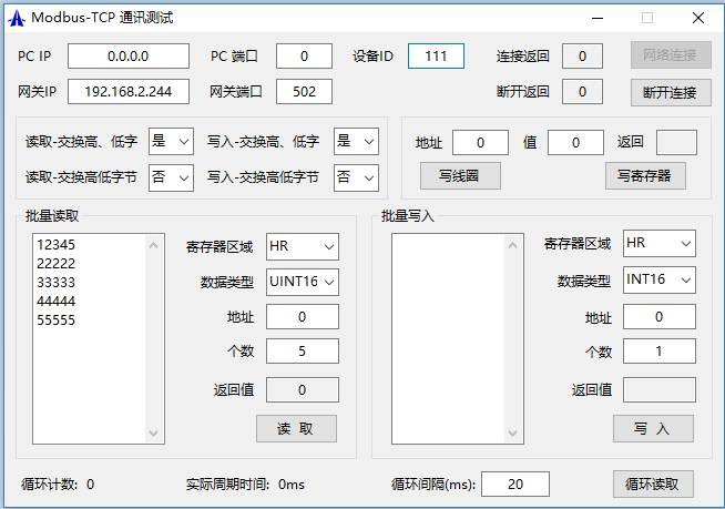 用參數配置軟件自帶的數據讀寫測試工具(‘工具’->‘數據讀寫測試’)測試,地址從0開始,測試界面如下: