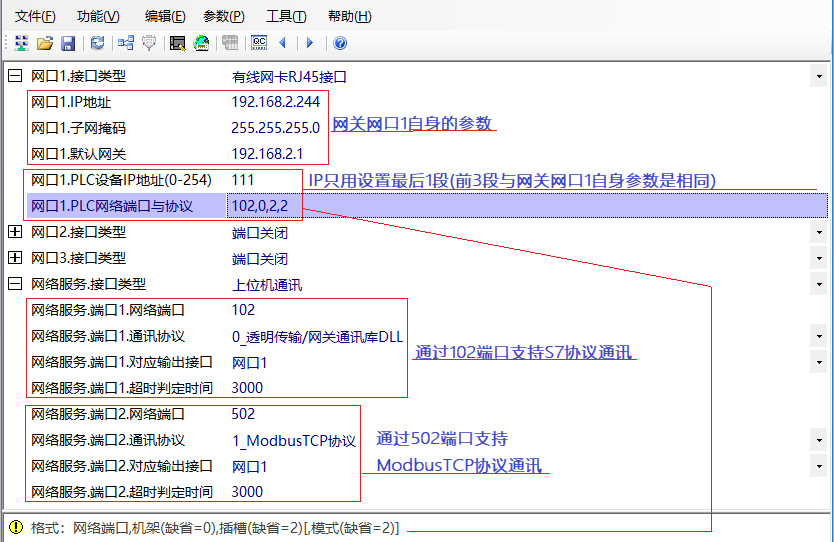 網關的網絡參數,實現ModbusTCP協議數據通訊,參數設置如下圖,選中要編輯的參數,消息欄會有相關提示: