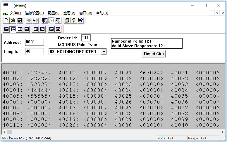 所有設置完成后下載到網關,重啟網關后開始測試,啟動Modscan32,設置IP地址、端口502,數據區域等參數,連接進行測試,可進行數據讀寫,界面如下: