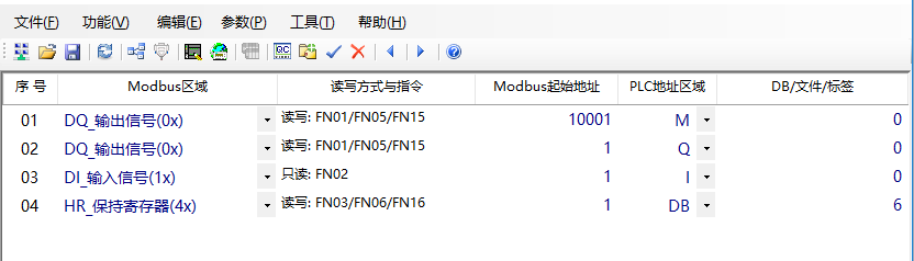 將網關與PC直連,上電后打開參數設置工具軟件,通過‘功能->‘Modbus地址表’,設置Modbus地址,將PLC的DB6對應到Modbus的HR區域,DB6.DBW0對應HR0(400001),I0.0對應100001,Q0.0對應000001,M0.0對應010001,設置完成后界面如下: