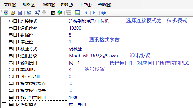 然后測試ModbusRTU協議,切換到串口設置頁面(‘視圖’->‘串口參數編輯’),設置網關的串口參數,界面如下: