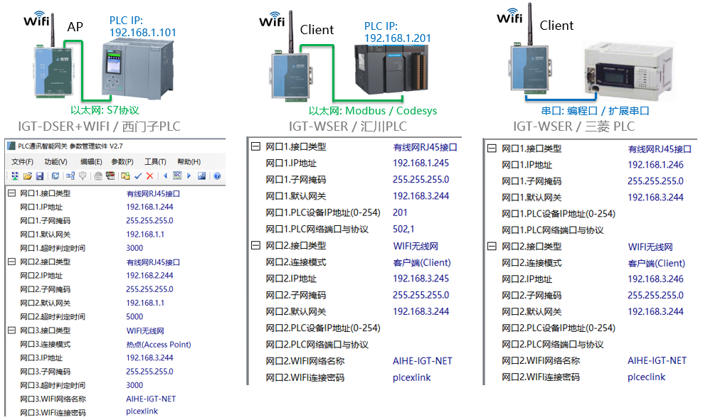 五、多臺PLC之間WIFI無線通訊:一臺IGT-DSER+WIFI智能網關做AP熱點,兩臺IGT-WSER智能網關設置為客戶端。