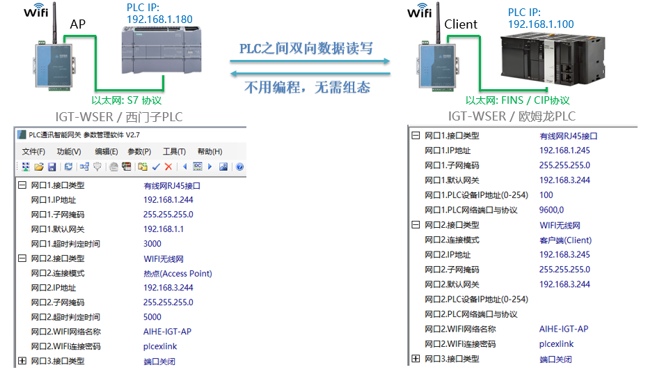 四、兩臺PLC之間WIFI無線通訊:兩臺IGT-WSER智能網關,分別設置為WIFI-AP熱點、WIFI-Client客戶端。