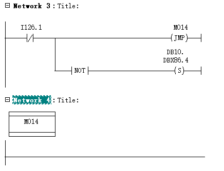 I126.1 ON 時(shí),置位DB10.DBX86.4; I126.1 OFF 時(shí),跳轉(zhuǎn)到M014處,不執(zhí)行置位DB10.DBX86.4。 |
