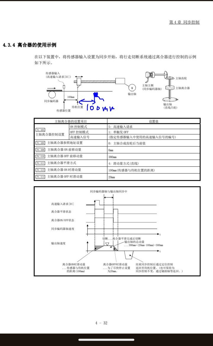 pr441凸輪行程量、先設(shè)置為的100mm(同步傳感器安裝于切刀下游的距離)+主軸電機(jī)(或皮帶編碼器)轉(zhuǎn)1圈時(shí)的皮帶移動(dòng)量。