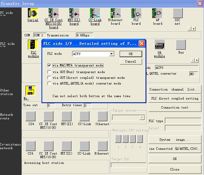 操作過程是這樣的:打開GX,點擊PLC讀取圖標,選ACPU,彈出傳輸設置對話框,PC I/F選COM1(電腦的口為COM1),PLC I/F選“使用MAC/MTA透明模式”,然后點擊“通信測試”,然后彈出“無法與PLC通信。可能有以下原因”對話框。 我們廠里有十幾臺A系列的PLC,我大概有一年沒有連接它們了,以前的操作都是沒有問題的,只是最近需要改個點,才發現了這種情況,也是百思不得其解,通訊電纜換過,電腦換過,都沒有解決問題。 |
