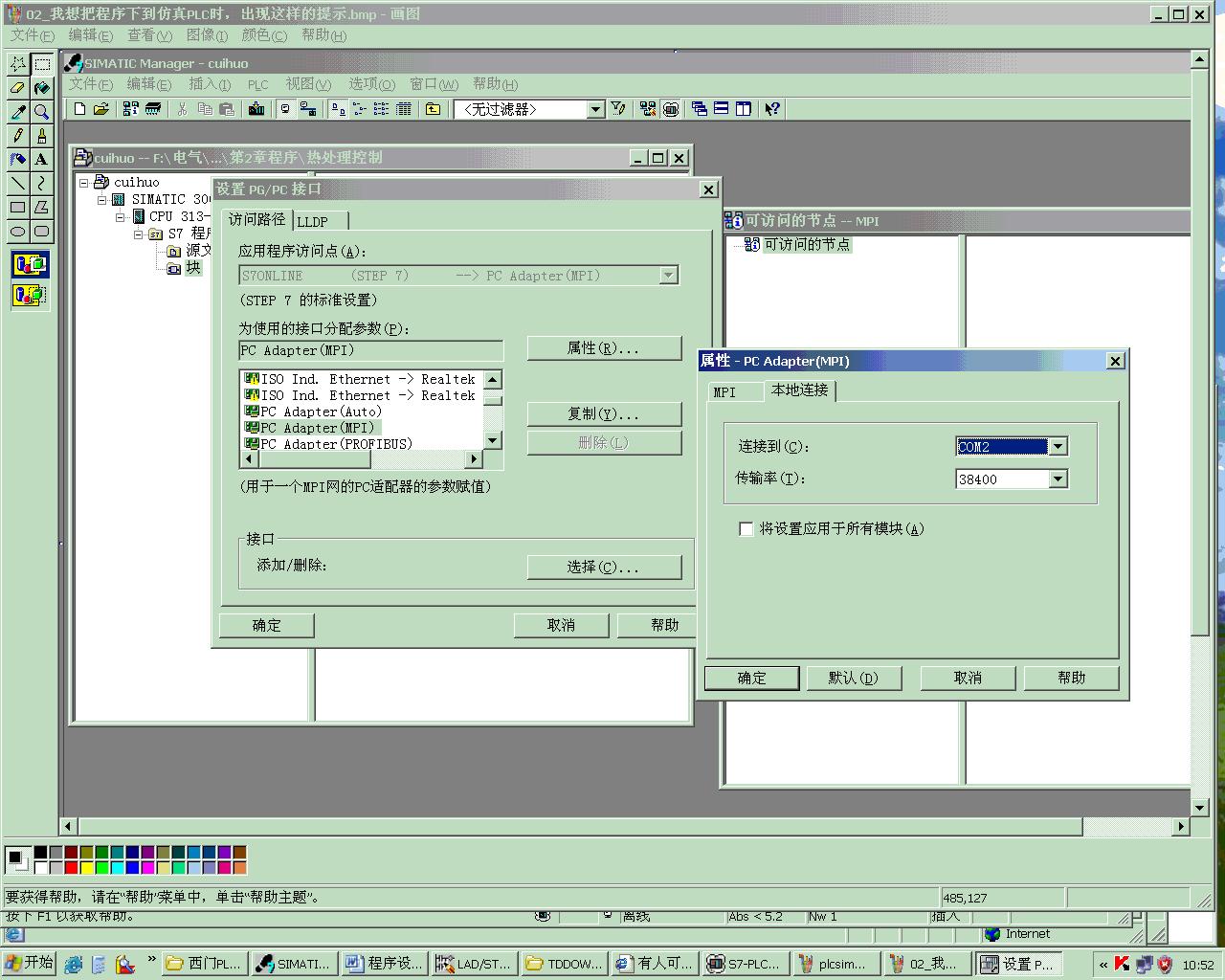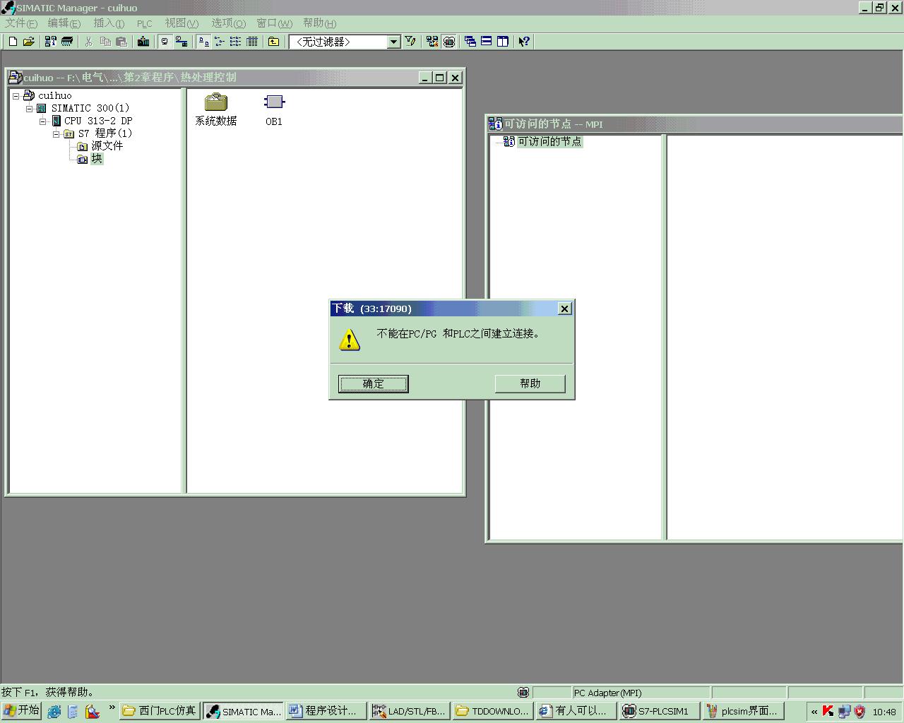 2、上下載程序時報錯,無法接通  (用的是標準樣例,MPI地址與硬件組態CPU地址相同)